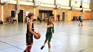 Das erste Spiel war geprägt von einem sehr hohen Tempo. Beide Teams spielten sehr viele schnelle Angriffe (Fastbreaks). Jeweils zwei Erfahrenere und zwei „Neulinge“ bildeten das EBV-Team. Schnell legte sich die Anfangsnervosität. Die Kinder spielten als Team sehr gut zusammen. Jede Spielerin/jeder Spieler hatte Anteil an den verdienten Siegen. Und das nicht nur mit den erzielten Punkten, sondern auch mit dem gezeigten Einsatz.