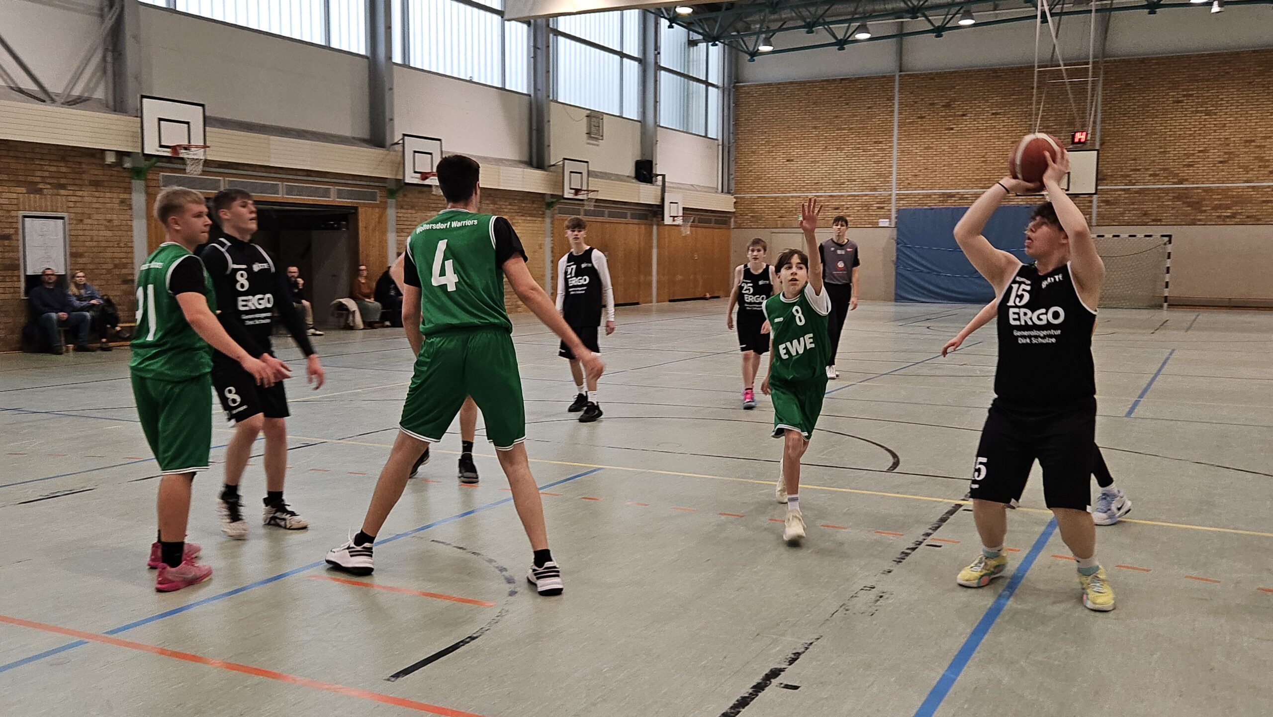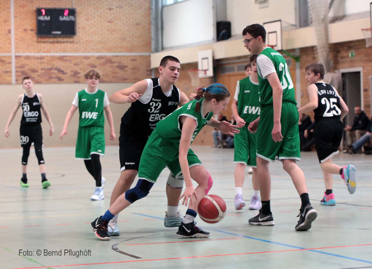 Der EBV begann mit Otto Engelien, Lia Charlotte Wilke, Tomke Domachowski und Lenny Rüdiger. Nach anfänglichem nervösem Beginn beiderseits kam es danach schnell zu den ersten Körben für beide Teams. Das Spiel war vorerst ziemlich ausgeglichen. Im zweiten Viertel kamen dann Diego Joel Schaeffer, Henry Matteo Pirke, Merle Müller, Karl Stolz zu ihrem ersten Einsatz. Mit guten Einzelaktionen und durch gutes Zusammenspiel wurde das erste Spiel gewonnen.