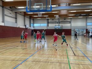 Das erste Spiel war geprägt von einem sehr hohen Tempo. Beide Teams spielten sehr viele schnelle Angriffe (Fastbreaks). Jeweils zwei Erfahrenere und zwei „Neulinge“ bildeten das EBV-Team. Schnell legte sich die Anfangsnervosität. Die Kinder spielten als Team sehr gut zusammen. Jede Spielerin/jeder Spieler hatte Anteil an den verdienten Siegen. Und das nicht nur mit den erzielten Punkten, sondern auch mit dem gezeigten Einsatz.